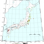 添付した参考図は、1月7日23:00〜1月8日23:00までの24時間のHi-net自動処理震源マップです。584個の地震が発生しています。これを見ると、東北から南下・・・ではなく、多発的にランダムに発生しているようです。